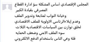 صفحة باسم “المجلس الاقتصادي ” تري ان سبب الأزمة هو ضعف ادارة القطاع المصرفي بقيادة الكبير ، واهمال مؤسسات الدولة للملف ، وقلة وعي المواطن بخدمات الدفع الالكتروني .