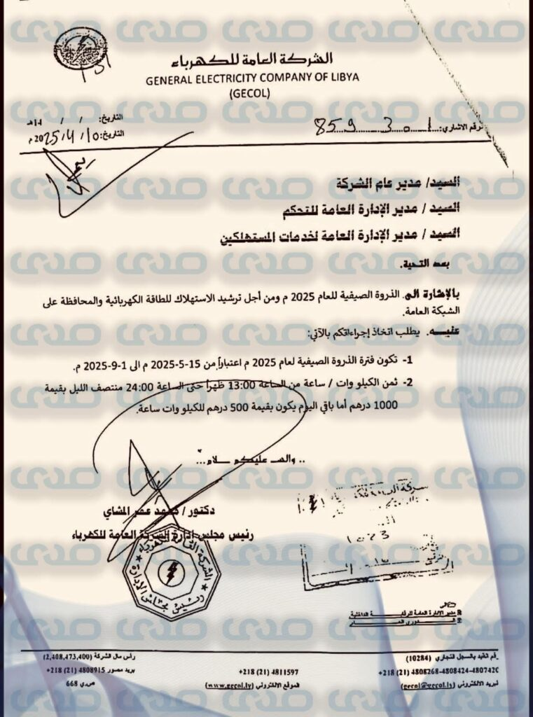 Sada Economic has obtained a decision from the Chairman of the Board of the General Electricity Company stating that the electricity rate during the summer peak hours — from 1 PM to midnight — will be set at 1 Libyan dinar per kilowatt-hour, while the rest of the day will be charged at 500 dirhams per kilowatt-hour.